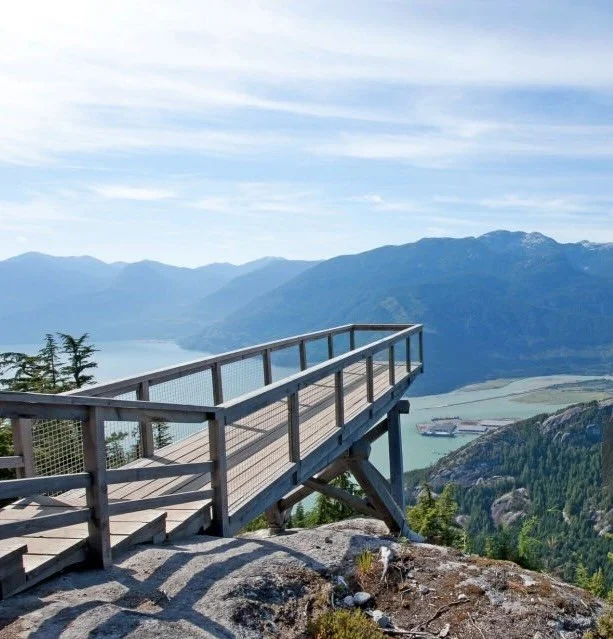 The Chief Outlook Viewing Platform is a short 15 minute walk along the Panorama trail. It leads you to a cantilevered deck that hangs over a sheer drop, offering a breathtaking view of the backside of Stawamus Chief